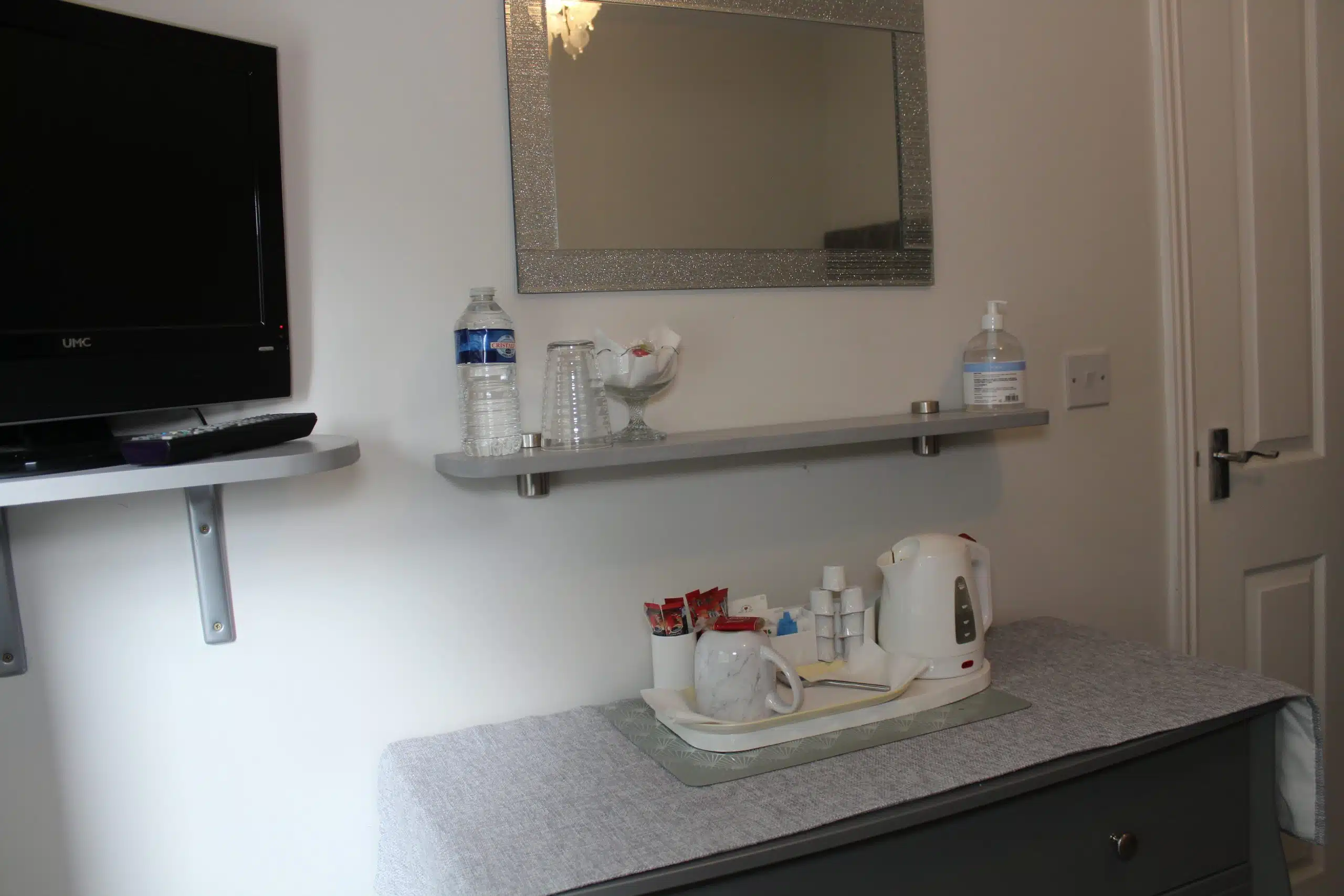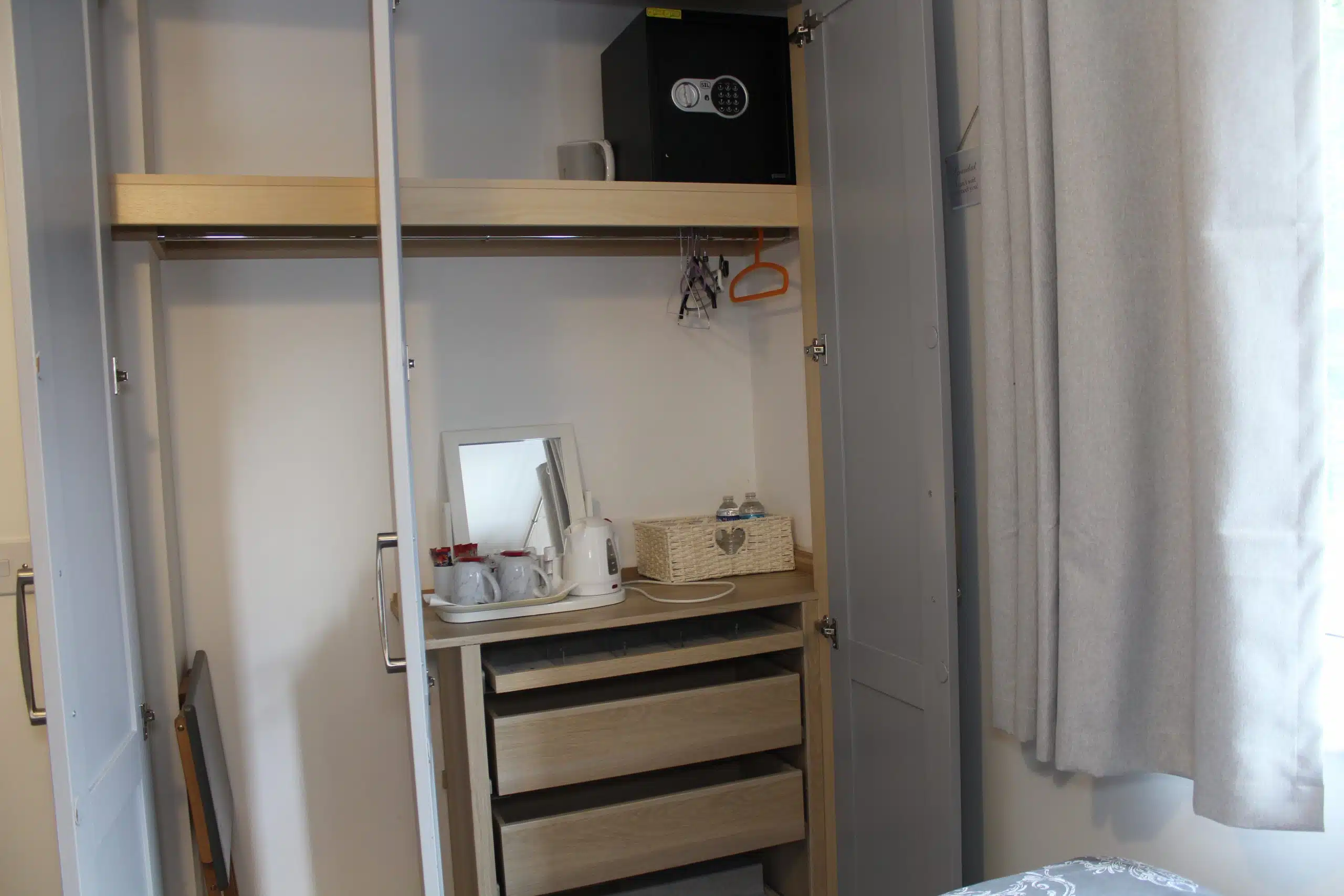 All our rooms are of the same design and feature plenty of wardrobe space, flat-screen TV with “Freeview”, tea and coffee making facilities with refreshments, free Wi-Fi and safety deposit boxes for your personal items, rooms are separated by a bathroom, which has a bath and overhead shower, there is also use of a separate wet room for all guests.